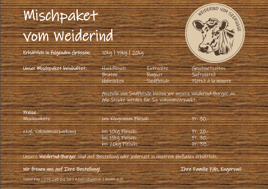 Grillsaison oder trister Nebeltag? Unsere feinen Hamburger sind immer ein Genuss. Pfiffig gewürzt und pfannenfertig bieten wir Ihnen ganzjährig die Weiderind- Burger an. Tiefgefroren im praktischen Zweierpack finden Sie diese in unserer Verkaufsecke. Probieren Sie diese mit Salat, im feinen Brötli oder einfach so pur. Auch Sie werden begeistert sein.